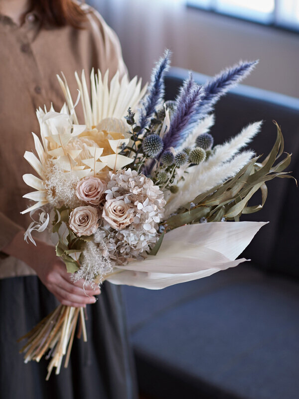 白のバンクシャにドライ・プリザーブド花材を組み合わせたトレンド感あふれるブーケです。