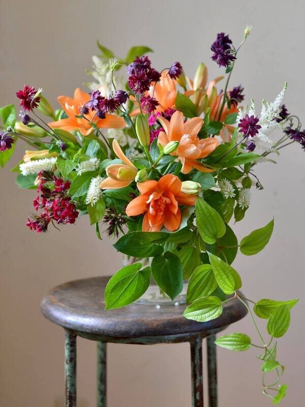 季節のユリ タイニーダブルユー と オダマキなどの小花をブーケにしました。