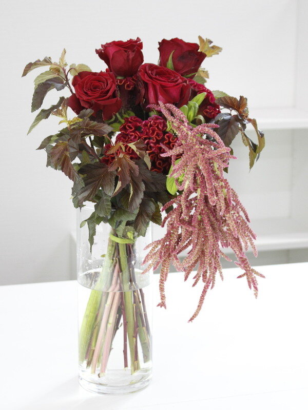 ケイトウと赤バラの花束