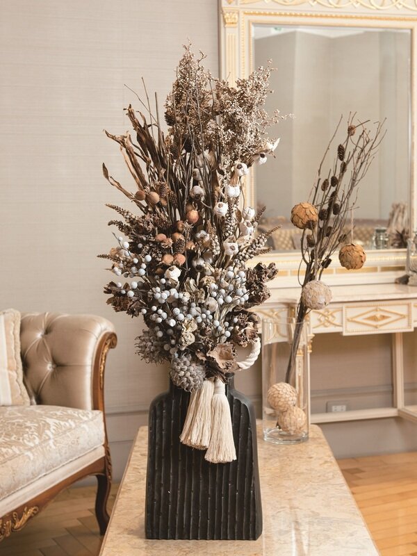 ペーパーに染色したフラワーのナチュラルなアレンジ。ラスティックなウエディングにも。