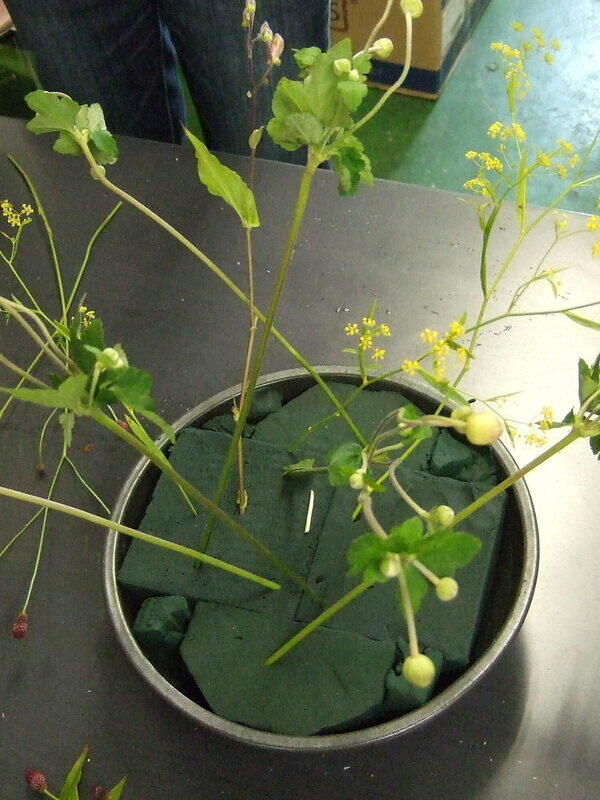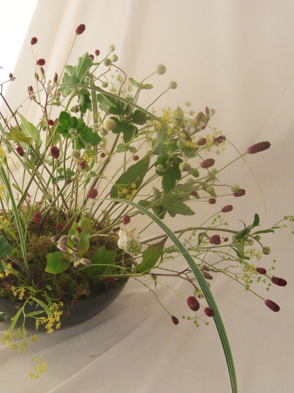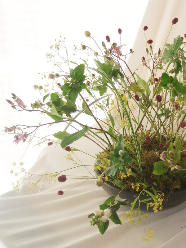 近藤しょうこ先生のうきうき花レシピデザイン。線の細い小花の形状を生かしてドーム状にアレンジ。足元にはコケを敷く。