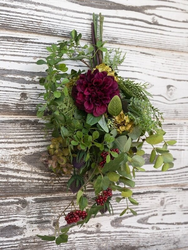 ダリアとユーカリで深み色を楽しむスワッグ。