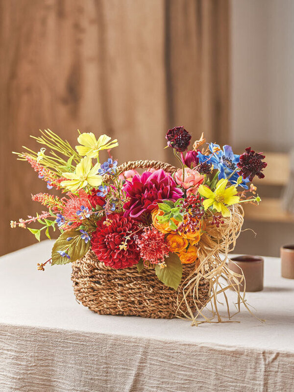 ウォームカラーの花々をバスケットで楽しむアレンジ。