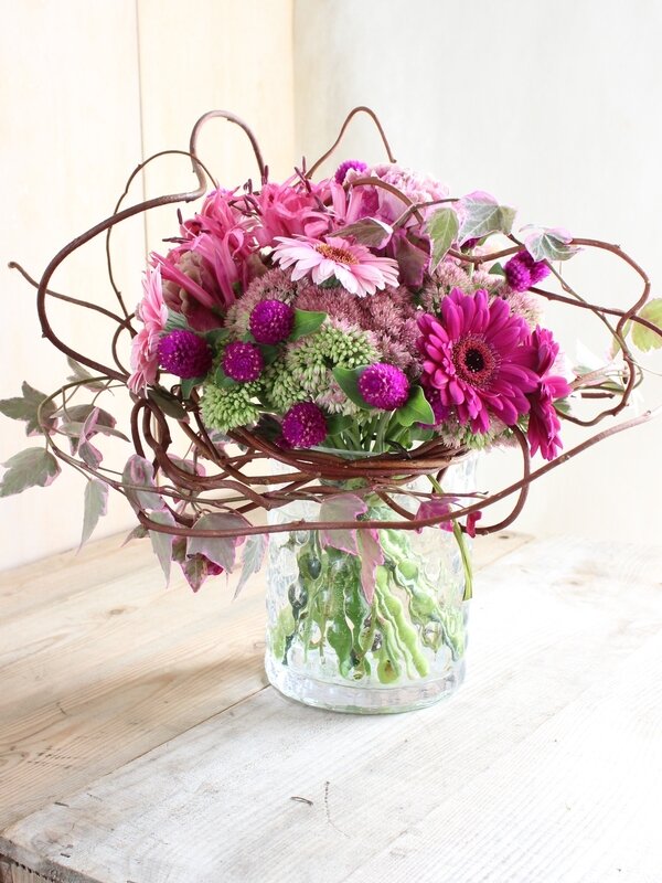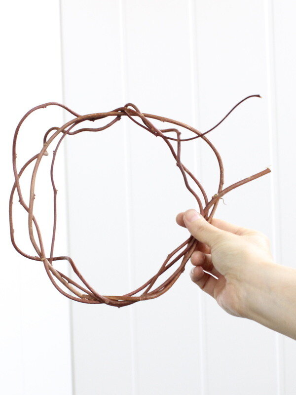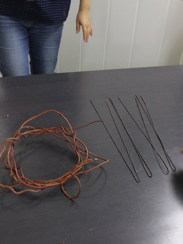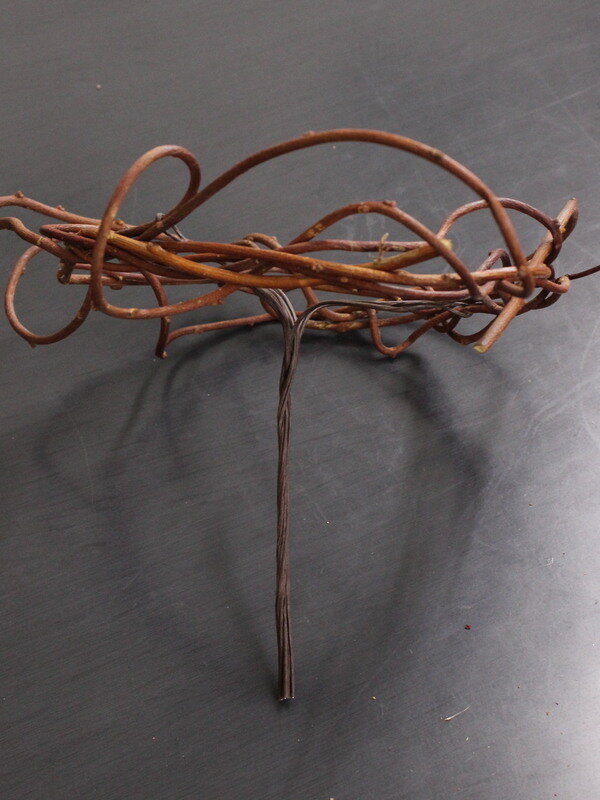 近藤しょうこ先生のうきうき花レシピデザイン。赤づるでゆるいリースを編む 直径25cmくらいワイヤー18番をUの字に曲げ、リースに三か所ひっかける。ワイヤーの足をリースの真ん中でねじってひとまとめにする。ブーケアシストの完成。アシストを手に持ち、リースの内側に花材を入れていく。アイビーも花材として入れ、ツルをリースにからませる。。