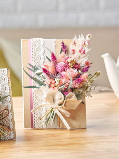 ブーケにしたドライフラワーをカードルにアレンジ。