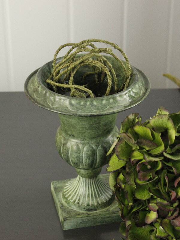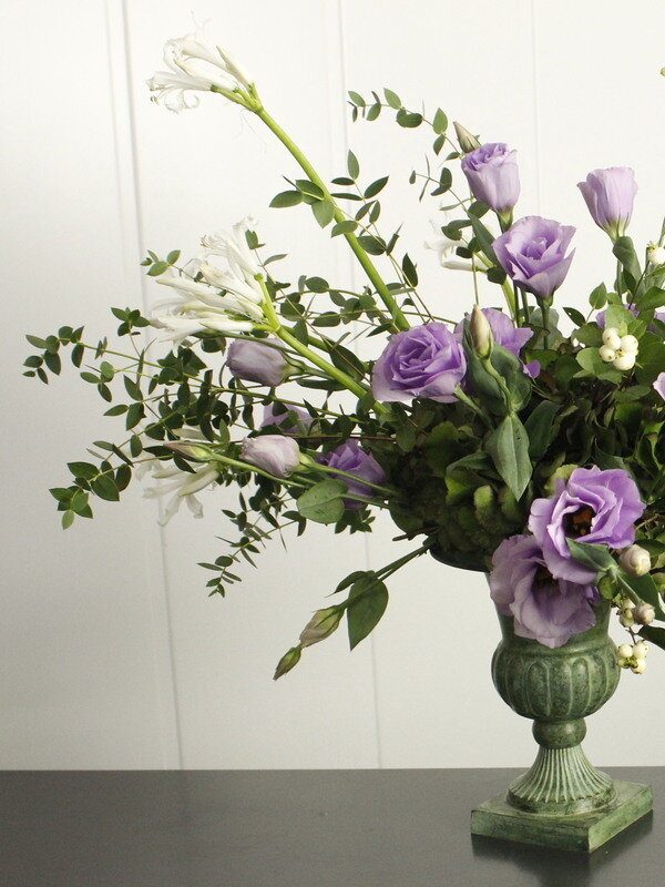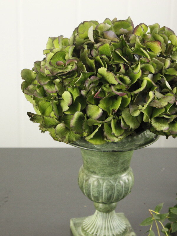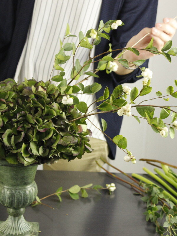 近藤しょうこ先生のうきうき花レシピデザイン。器にラスティックワイヤーを丸めて入れる。(花どめ)アジサイをいれるアジサイの上からシンフォリ、ユーカリを入れてアウトラインを決める流れに沿ってトルコ桔梗、ネリネを入れるネリネは鞘(さや)を剥く。