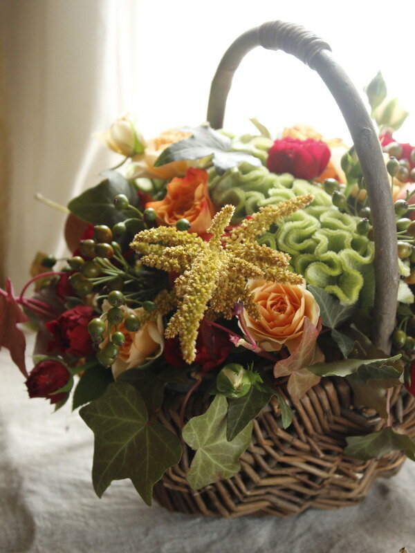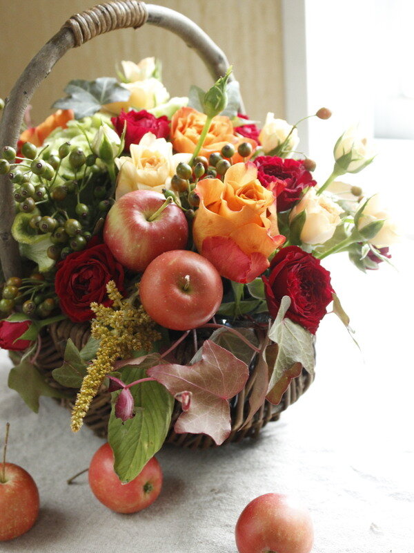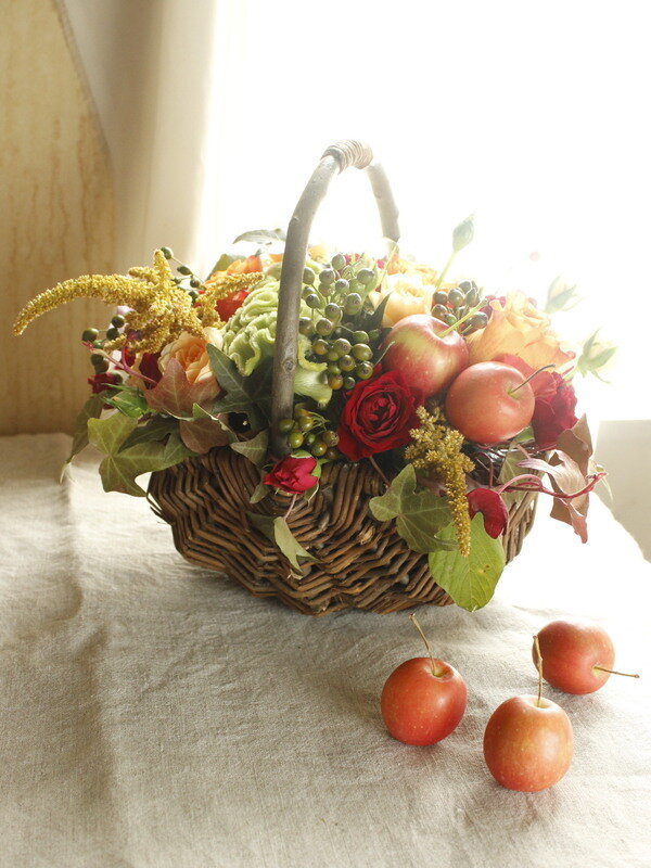 バラの秋色バスケットアレンジ
