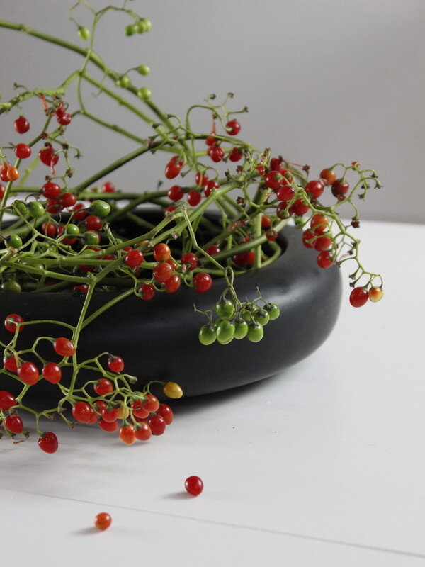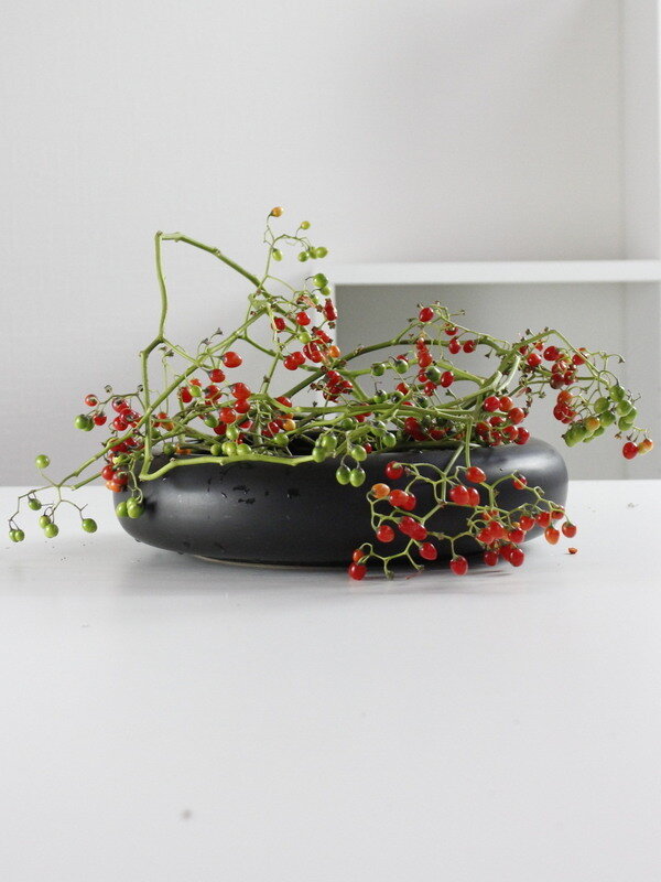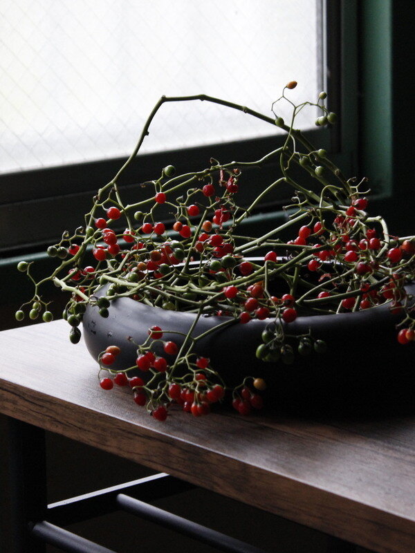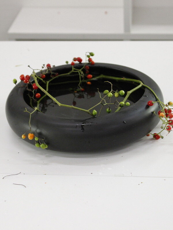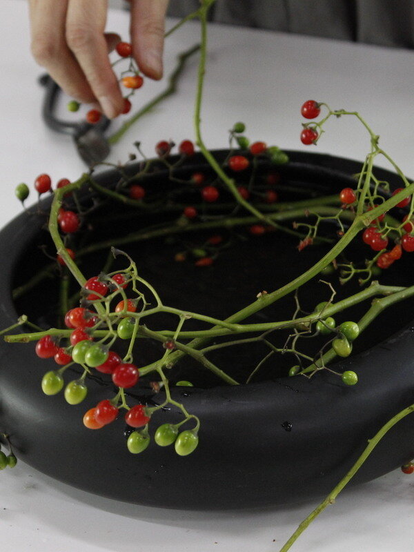近藤しょうこ先生のうきうき花レシピデザイン。水盤の上で枝を絡ませながら丸くリース状にあしらう。