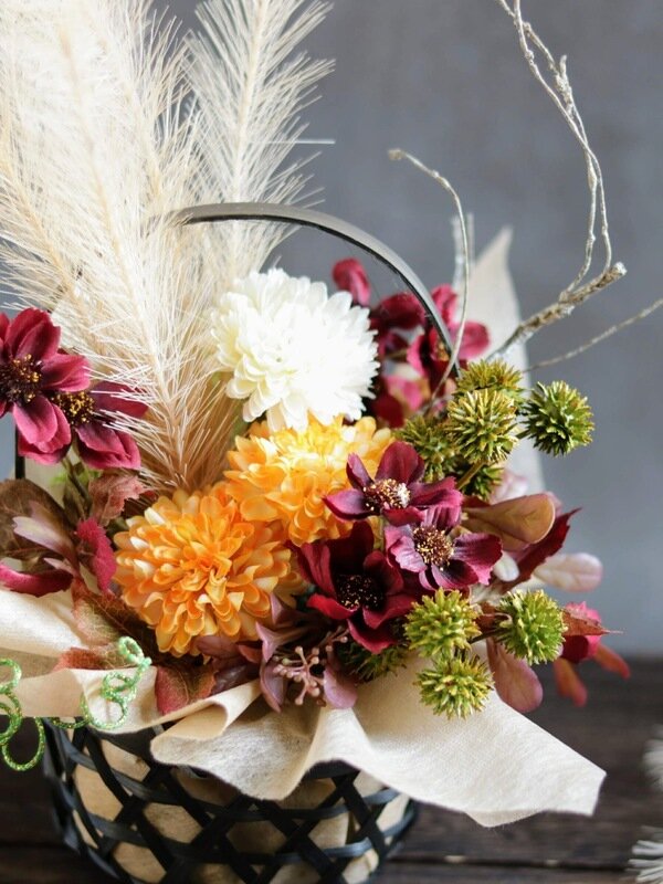 丸いピンポンマムをお月さまとお団子に見立てたお月見風アレンジです。竹籠も丸を選んで優しい雰囲気に。敬老の日のプレゼントにもよいですね。
