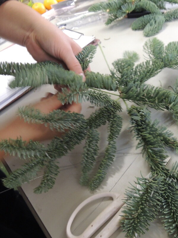 近藤しょうこ先生のうきうき花レシピデザイン。オレゴン産モミ枝ブランチ 形の整った先端5本ワイヤー18番ワイヤー26番オーナメントなど。--------------。ワイヤー18番を3本程度1束にしてテーピング。※(こめ)印のような形になるようワイヤー26番で固定する。ワイヤーのベースにモミ枝をくくりつける。中心に雪の結晶のオーナメントをとりつける。お好みで枝に飾りをつける。。。