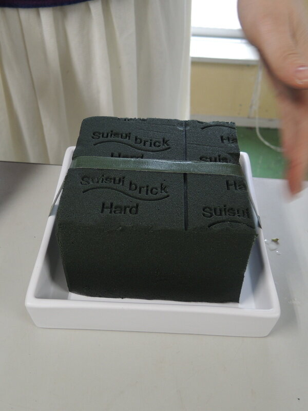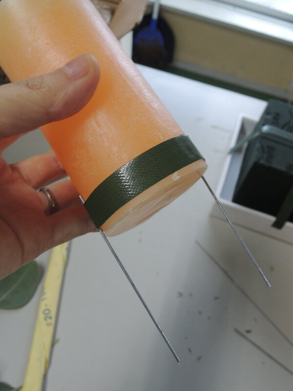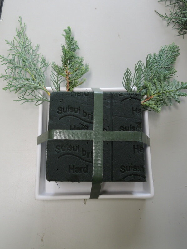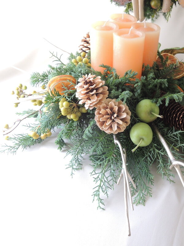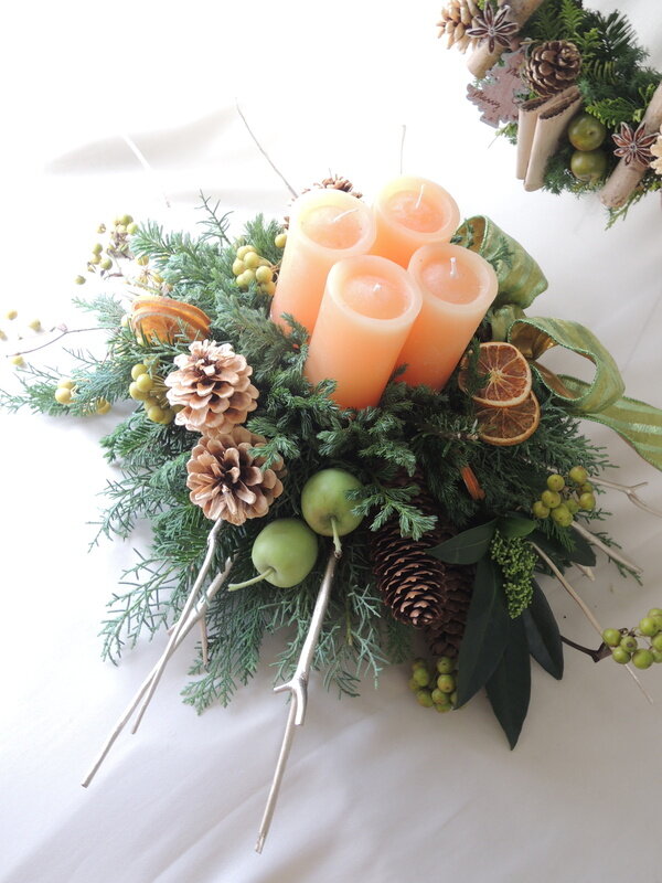 近藤しょうこ先生のうきうき花レシピデザイン。お皿に給水フォームを固定する(防水テープ使用)キャンドルにはワイヤーの足をつけておく(防水テープ使用)松カサや青りんごなど飾りのものにワイヤリングしておく。給水フォームをコニファー類で埋める。中心にキャンドルを置く。ミツマタの枝をカットしたものを横に挿す。お好みで飾りの花材を加える。。
