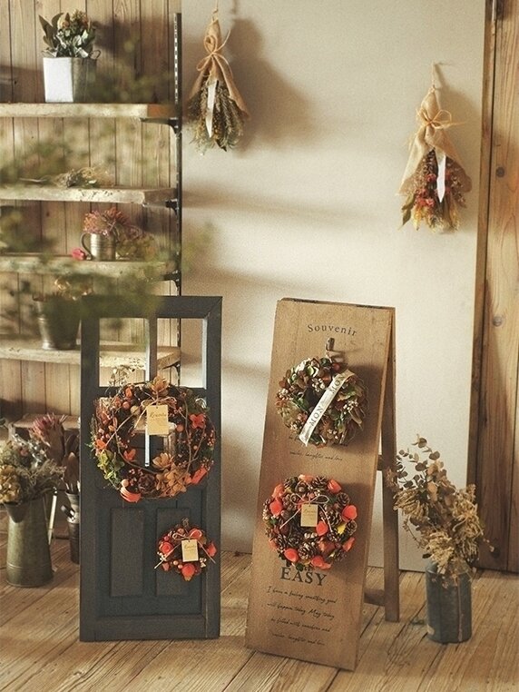 個性豊かな秋色リースが出来上がりました。色とりどりの木の実たっぷりのリースを飾って、秋の訪れをたのしみませんか?