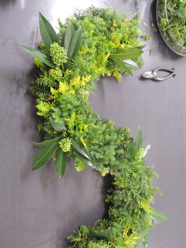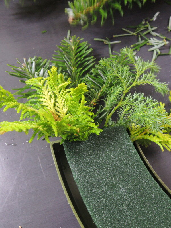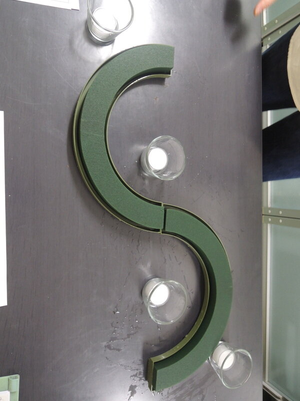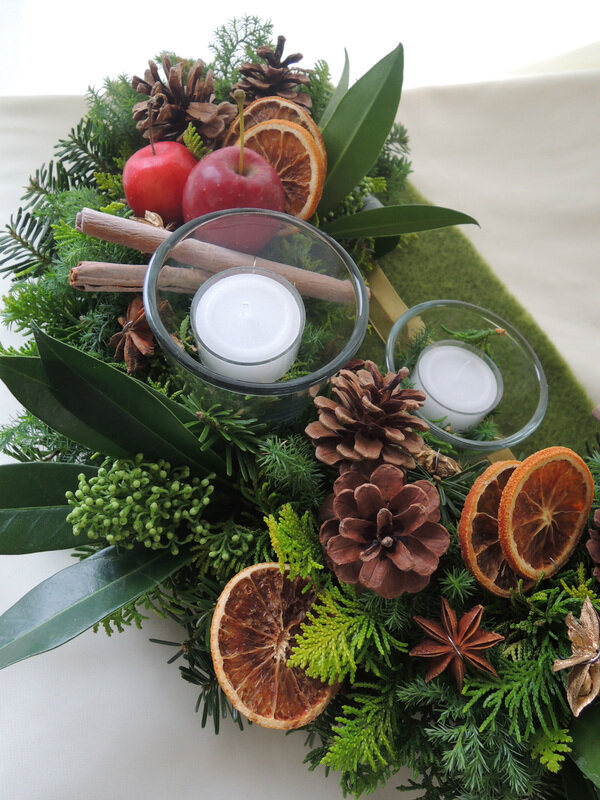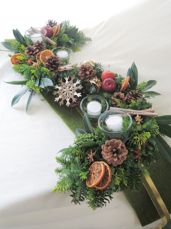 近藤しょうこ先生のうきうき花レシピデザイン。ハーフ型の給水フォームを使ったクリスマスアレンジのアイデア。キャンドルホルダーや飾りを点々とあしらってテーブルの演出に。。