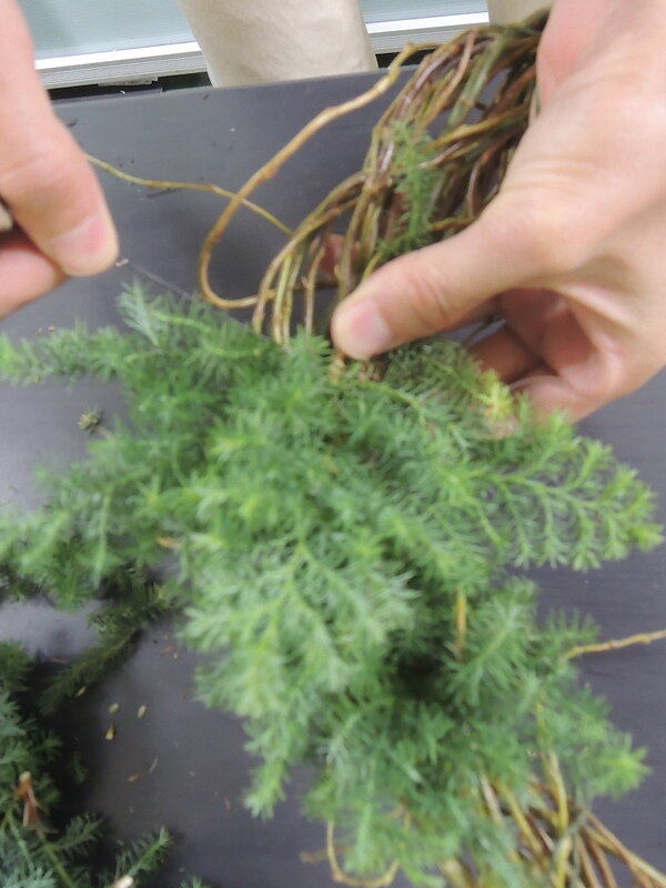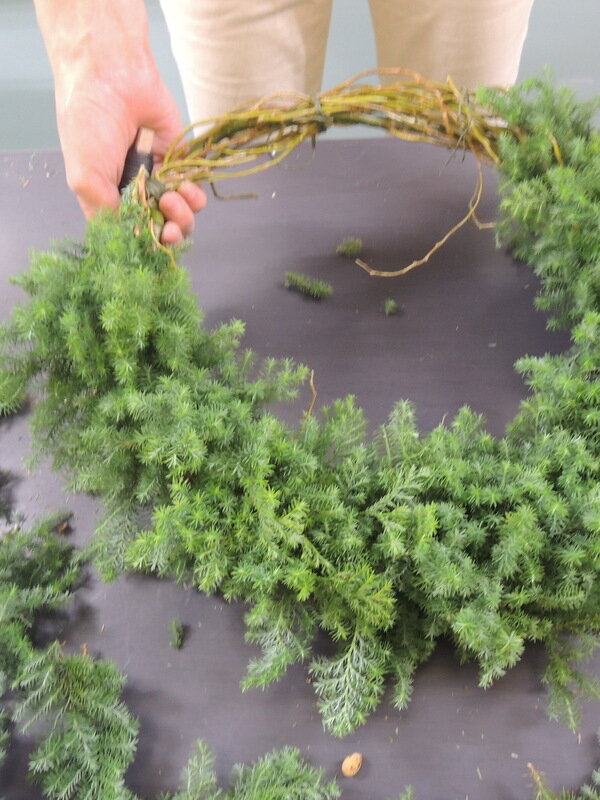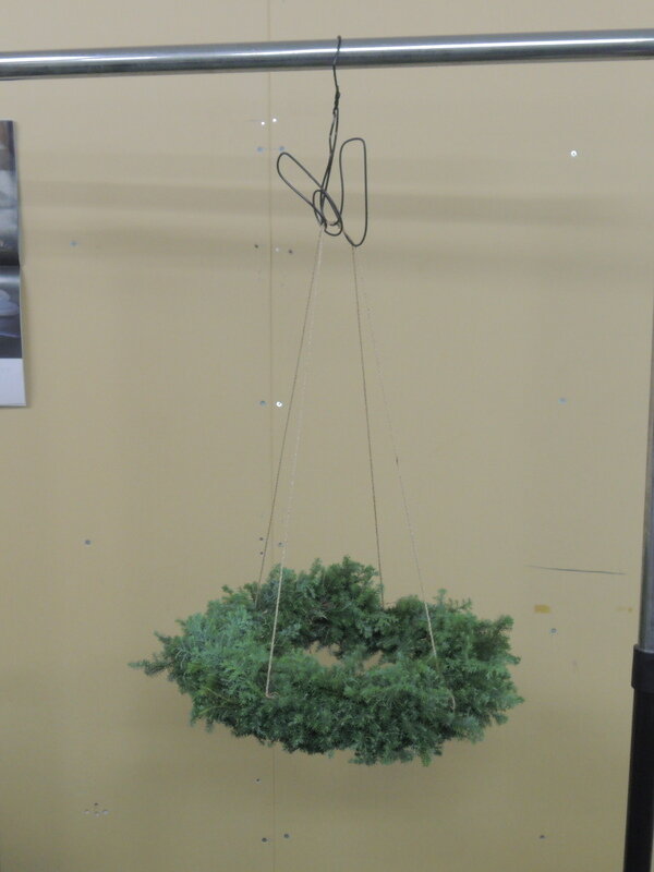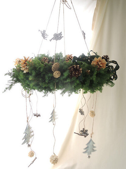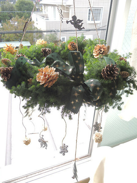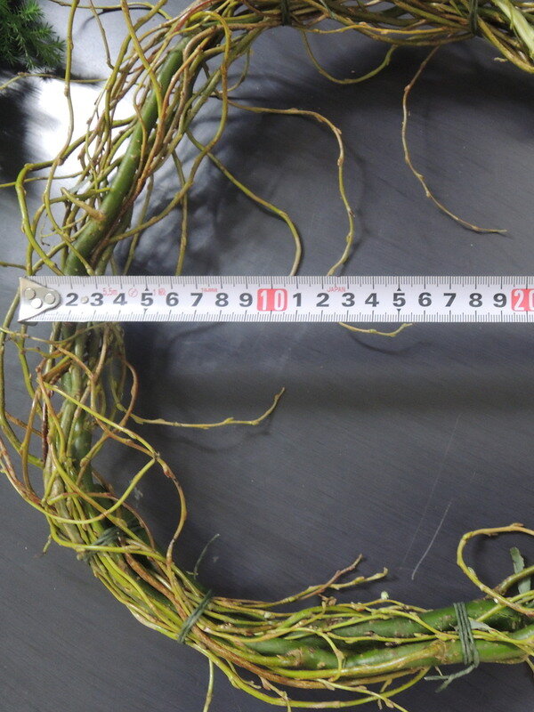 近藤しょうこ先生のうきうき花レシピデザイン。雲竜柳2本程度で直径30cmくらいのリースをつくる。リースワイヤーでヒムロスギを巻き付ける。60cmくらいので約5本使用麻ひもでバランスをとりながら吊る。ワイヤリングした松カサ、リボンなどをつける。麻ひもでオーナメントを吊り下げる。。