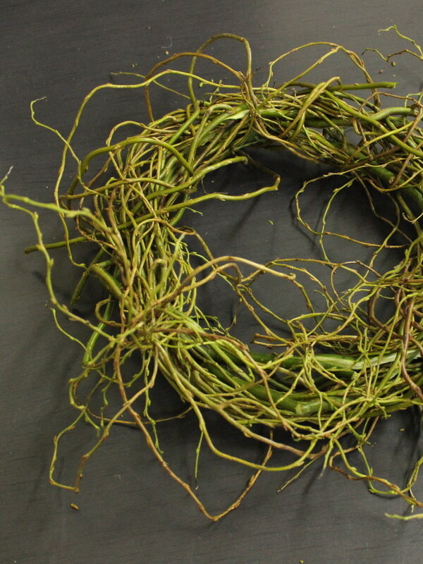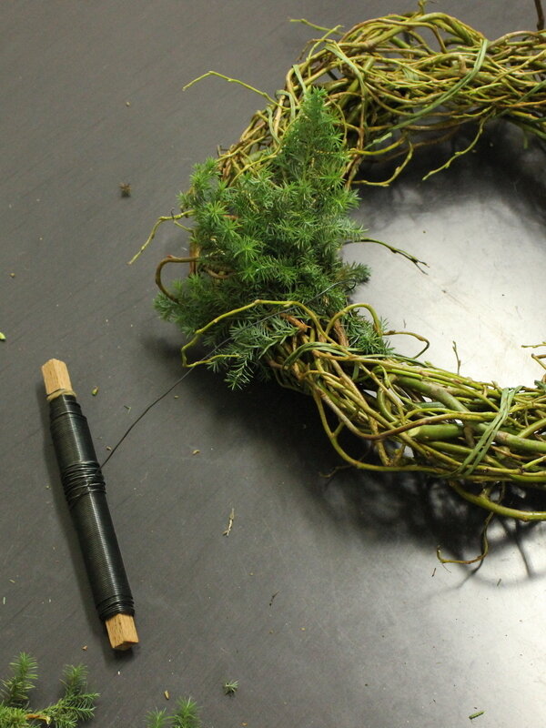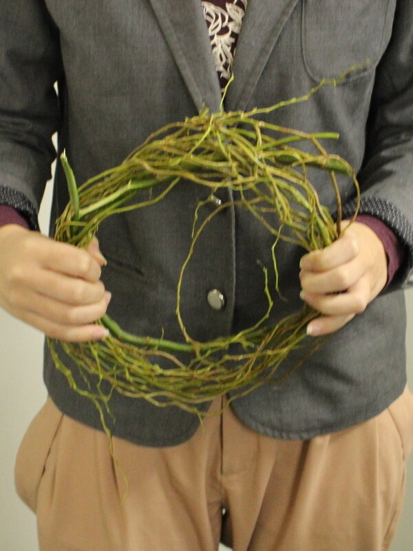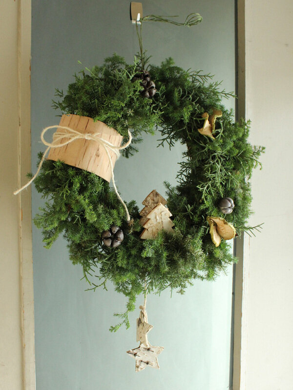 近藤しょうこ先生のうきうき花レシピデザイン。雲竜柳約3本でベースをつくる。直径25cm程度。太いリースを作りたいのでベースもすこし太め。ヒムロスギ、コニファーブルーアイスをパーツにカット。ヒムロスギ60c,m程度4.5本、ブルーアイス60cm程度 1本使用。リースワイヤーでベースに巻き付ける。白樺ロールを巻き付け麻ひもで止める。好きなオーナメントや飾りをつける。出来上がり外形30cm程度。