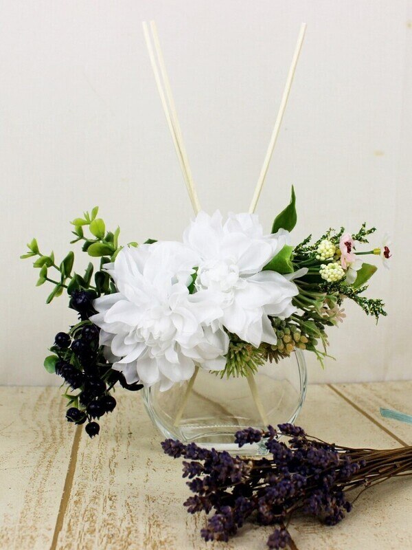 ホワイトダリアと小花をあわせてナチュラルなディフューザーに。