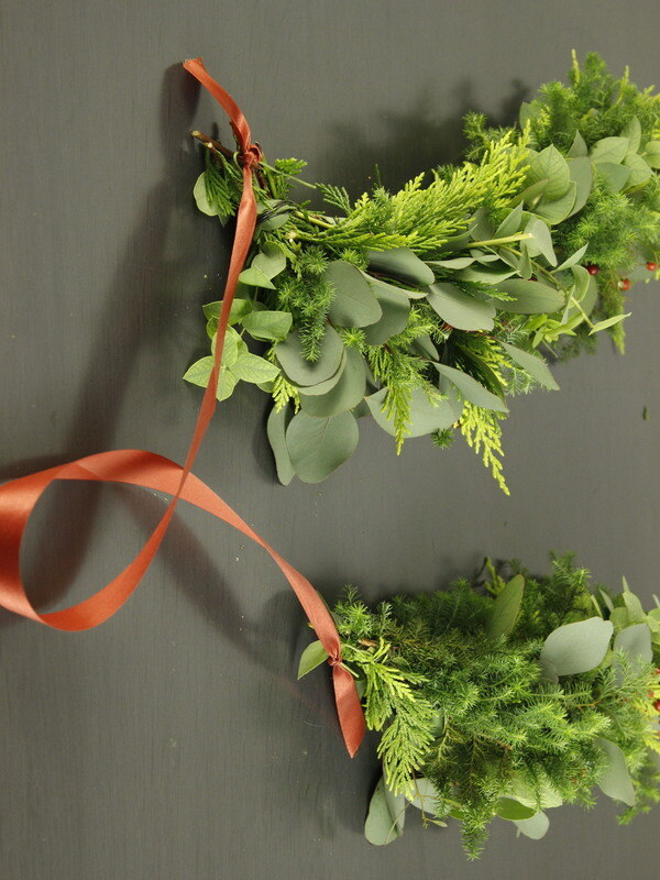 近藤しょうこ先生のうきうき花レシピデザイン。ドイツトウヒをワイヤリングする。ワイヤー18番を芯にし、ドイツトウヒのワイヤとまとめてテーピングする。片足の先端は丸めてひっかけの部分を作っておく。ワイヤー18番の芯にコニファー、実もの、ユーカリをまきつける。(リースワイヤー使用)。これを2本つくる。ひっかけの部分にリボンを通し、2本をまとめる。結び目にリボンを結んで出来上がり。。