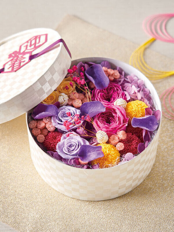 友禅紙のサークルボックスを使った迎春アレンジ。