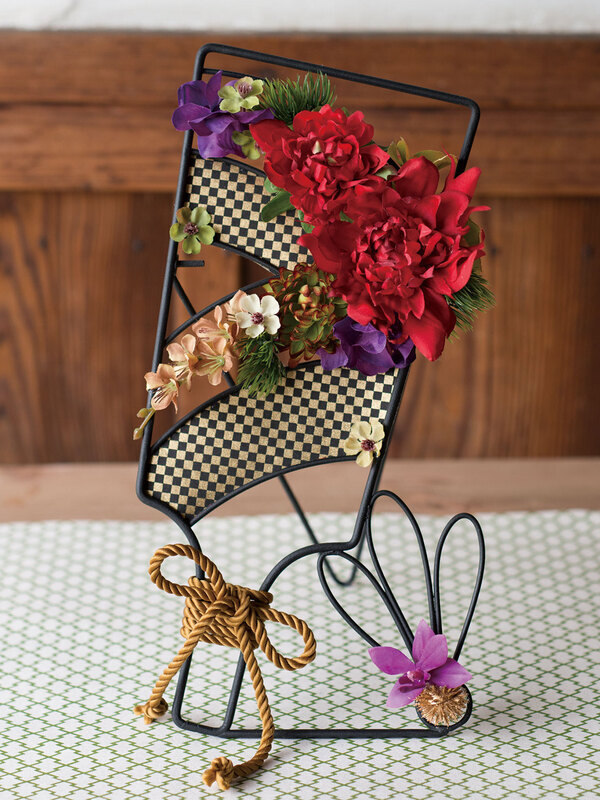 お正月アレンジ向けの羽根つきワイヤースタンド。