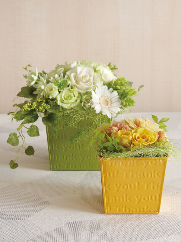 母の日はもちろん1年中サンキューが伝わるブリキ花器。◎使用商品071-01374 NatureDesigns/サンキュー! M ピスタチオ/44712071-01383 NatureDesigns/サンキュー! S サニーイエロー/44722