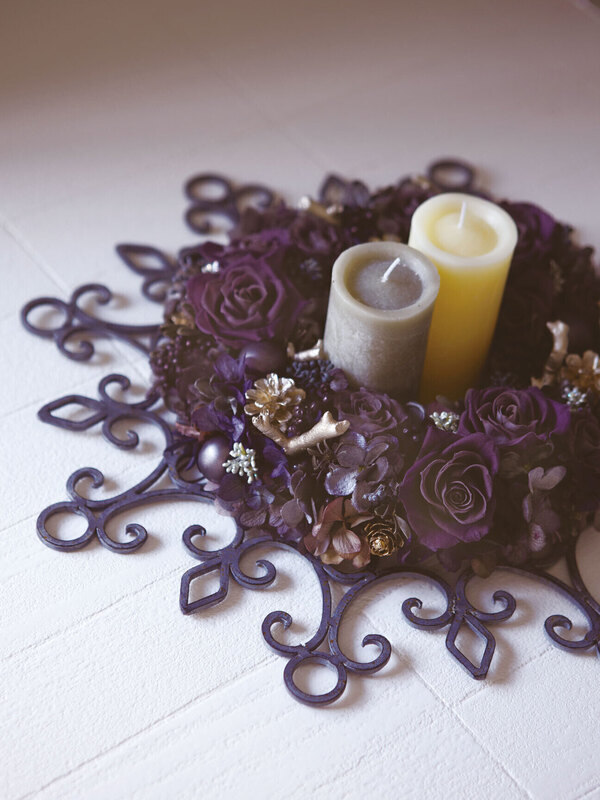 サニーリースを置いてフラワーとキャンドルで飾り付け。◎使用商品071-00341 NatureDesigns/サニーリース40cm グレイ 44731/118-44731-0