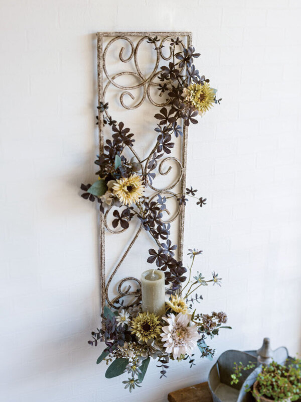 下部に折りたたみ皿の付いたアレンジしやすい壁掛け。