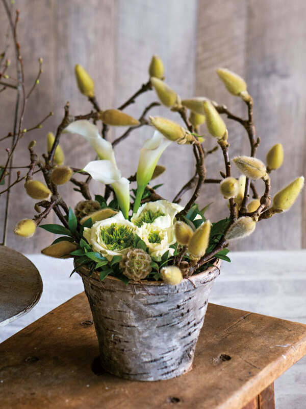 ナチュラルアレンジメントに定評のある樺の皮で作ったカゴ。ひとつひとつ色などが異なります。個体差をお楽しみください。◎使用商品071-01220 NatureDesigns/バーチ・ラウンド大 [ライナー付] ナチュラル/45250