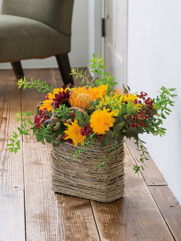 くるくるとした枝が特徴的な持ち手付き・バッグ型花器。