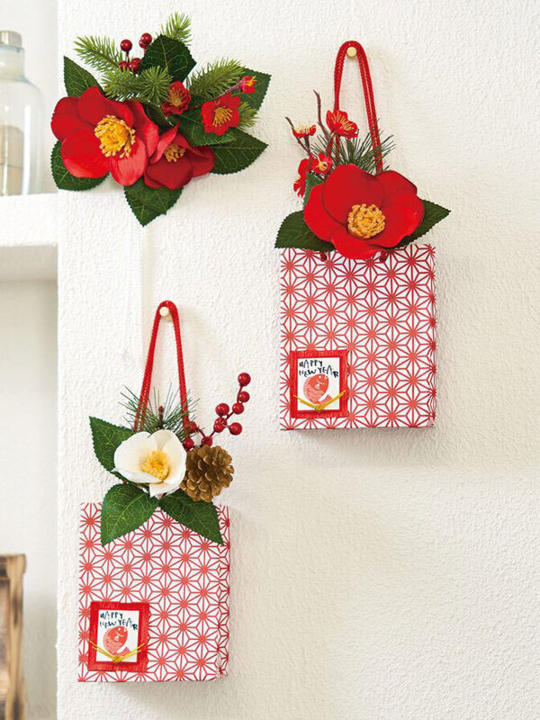 和紙風のラッピングペーパーと紅白の椿で、めでたくかわいいバッグ風に!