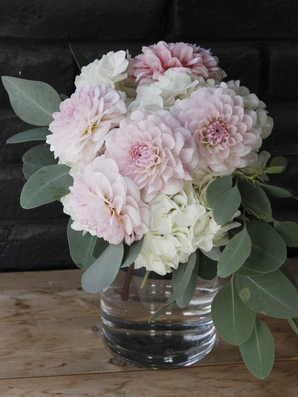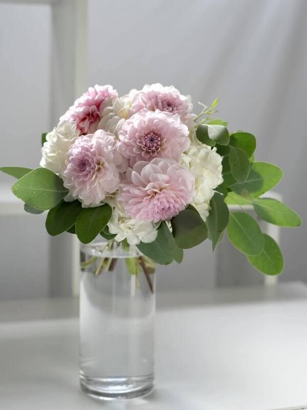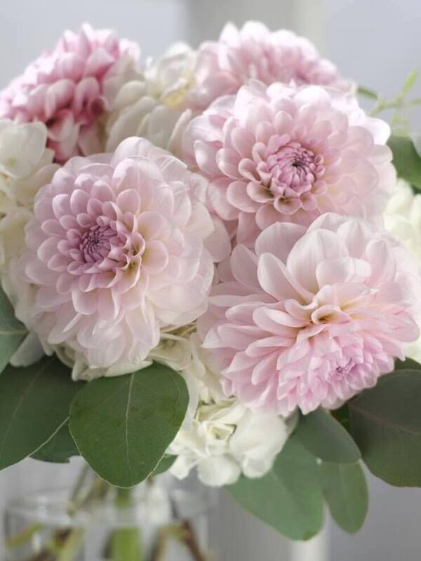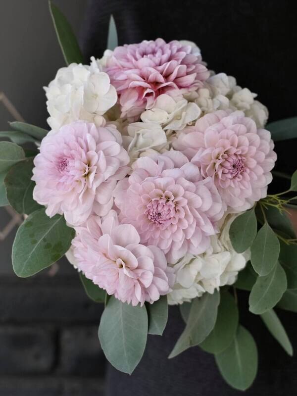 。近藤しょうこ先生のうきうき花レシピデザイン。アジサイをクッションにダリアを差し込むように束ねます。外側にシルバー系のユーカリの葉を入れると秋冬バージョンになります。ブライダルにも。