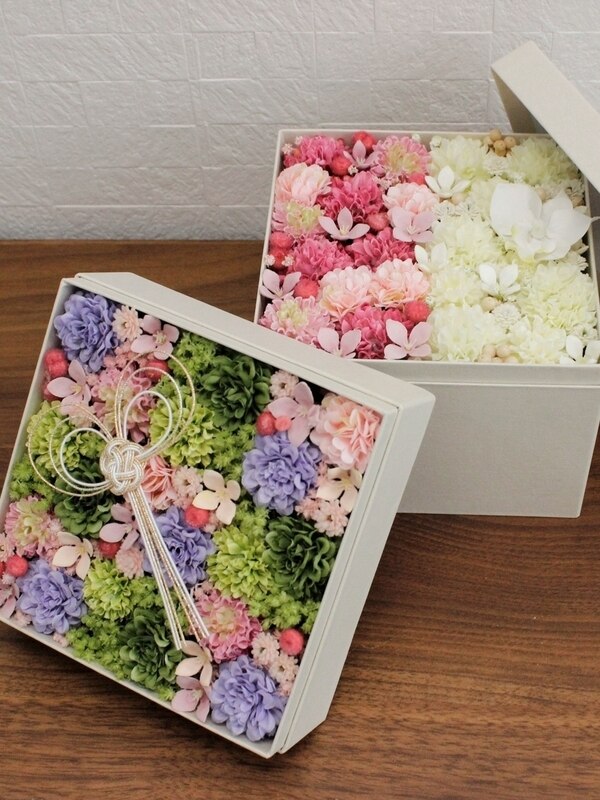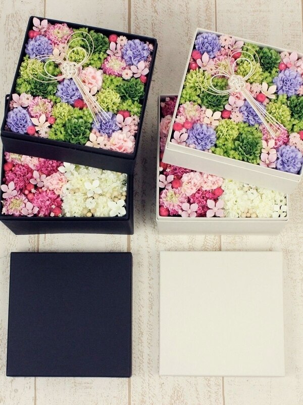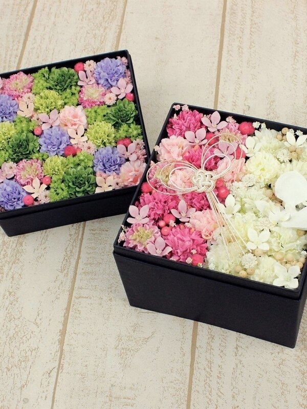 フラワーデザイナー佐藤俊輔さんデザイン!豪華な2段ボックスで作るフラワーお重アレンジ。色とりどりのマムが美しく、贈り物にもピッタリ。お正月過ぎたら水引飾りを取って和のアレンジとして楽しんで頂くこともできます。