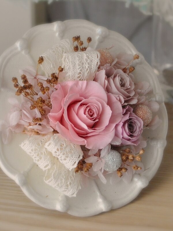 ショップでは、プリザーブドフラワーを中心につまみ細工や水引、レジンなどで、お花モチーフの雑貨やアクセサリーを販売しています。
