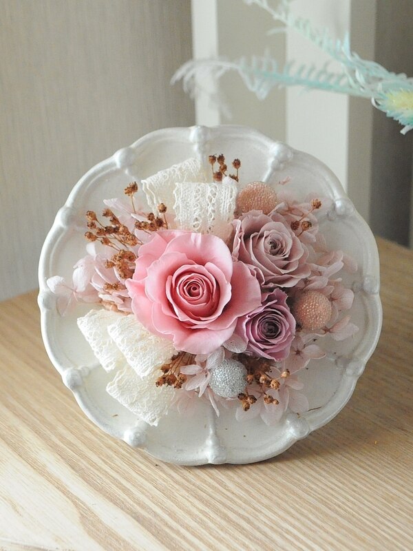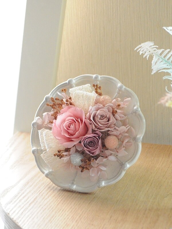 丸くてロマンティックなclay社のNadia(ナディア)に、乙女ティックな色合いのバラでアレンジしました。大きすぎず小さすぎず、専用ケースもあるので、プレゼントや訪問の手土産にピッタリのアレンジになりました。