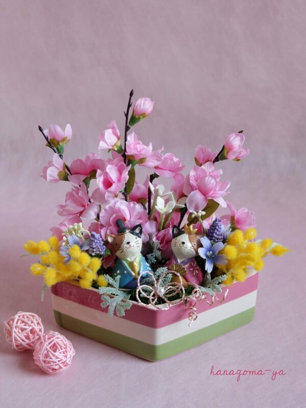 桃の節句では定番の『ひしもちポット』を使ったアレンジメントです。オーソドックスな組合せですが、ねこのお雛さまが何とも愛らしく華やぎます。