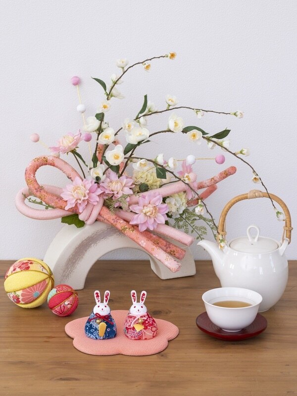 お手玉うさぎひなを飾ったひな祭りアレンジ。