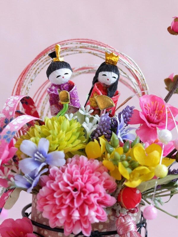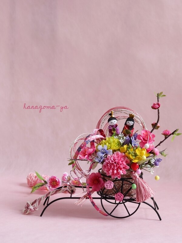 黒のワイヤー御所車に桃、菜の花、マムなど、ひな祭りの定番のお花をあしらい、優美な花車に仕立てました。御所車とは平安時代の貴族の乗り物で、雛飾りの道具にもあります。平安の雅な和の趣をワイヤー製の御所車で現代風に。