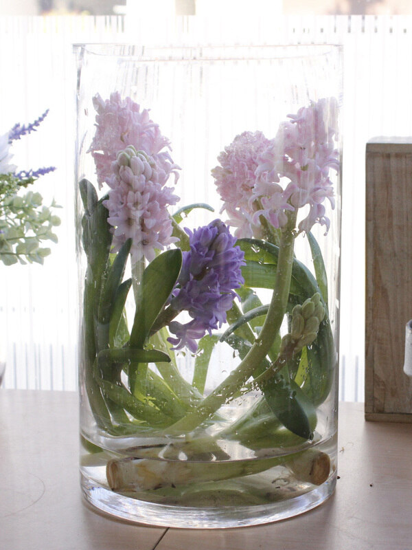 ヒヤシンスは頭が重く、伸びます。日の光の方へのびる性質がありますので、折れたり倒れたりしやすいです。大きめのシリンダーなどに花全体を入れてしまうと壁ができて飾りやすくなります。お水は少なめに。葉の量は調節してください。。らせん状に傾けて入れるとみ美しいと思います。小さめのシリンダーに1本ずついれて複数飾っても素敵です。。画像のものはφ18cm×高さ30cmのシリンダーです。