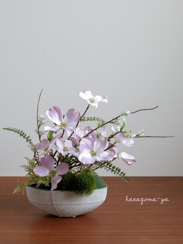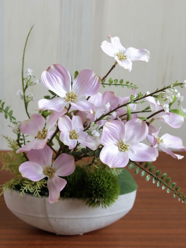 桜と並んで日本で人気のあるハナミズキ。ほんのりピンクのぼかしが頬にさした紅のようでとても愛らしい印象です。マットな質感の花器がハナミズキのピンクを一層引き立て、春霞のような印象に仕上がりました。