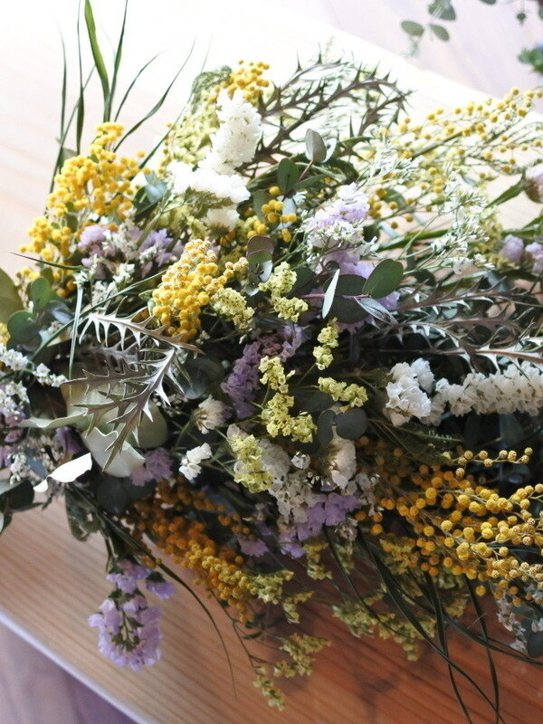 ミモザイエローを引き立たせるよう、優しい色合いのスターチスとグリーン多めに束ねました。ミモザの色合いが変化してアンティークな雰囲気のスワッグとして長く楽しんで頂けると思います。