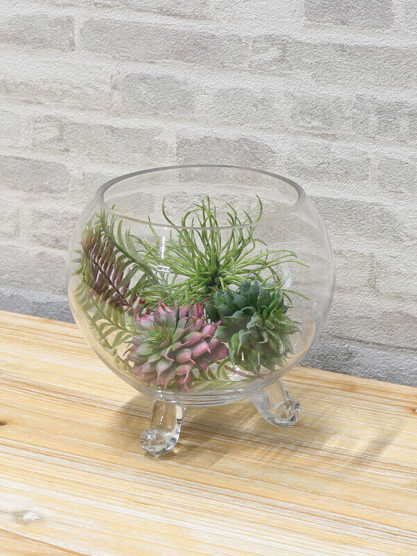ネコ足のついたミニガラスドームに多肉植物の造花を詰め込みました!球体型のガラスは中身を華やかに見せてくれます。