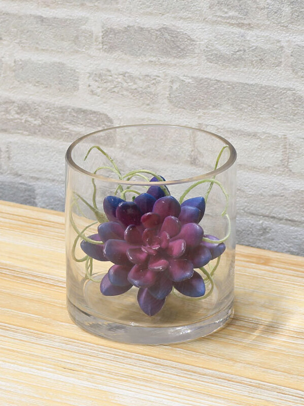 高さが低めに作られたシリンダーガラスベースを使用。こんな感じで造花をポンと入れるだけでもかわいらしいテーブル装飾に♪