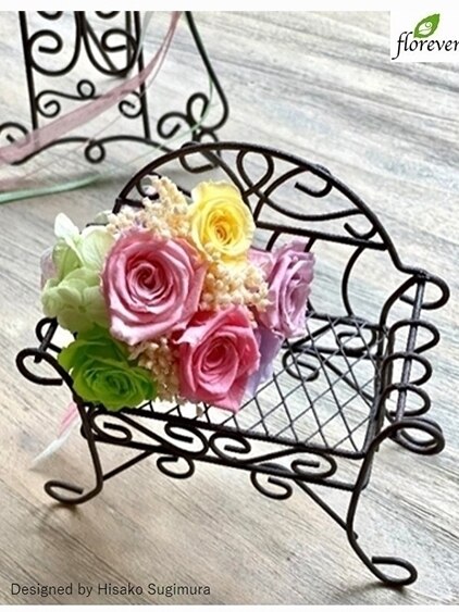 ワイヤーベンチにお花を添えた春らしい色合いのアレンジメント。