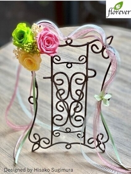ワイヤーフレームに春らしい色合いのプリザーブドフラワーをアレンジ。