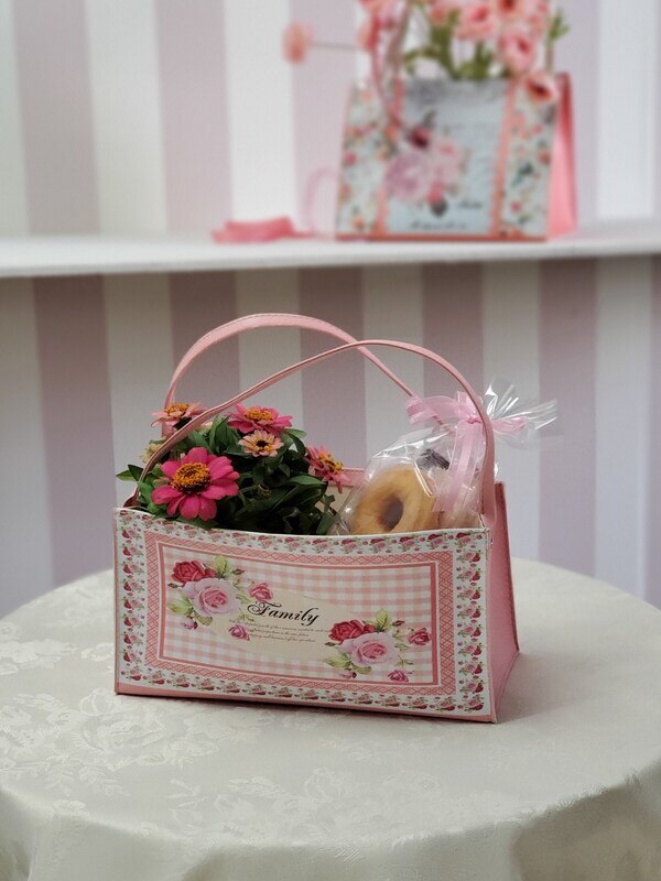 フラワーアレンジとしてプレゼントした後も色々な用途でお使いいただける、おしゃれなミニバッグを使用したアレンジメントです。長く使えるので喜んでいただけそうですね。母の日などの特別なギフトにおすすめです。