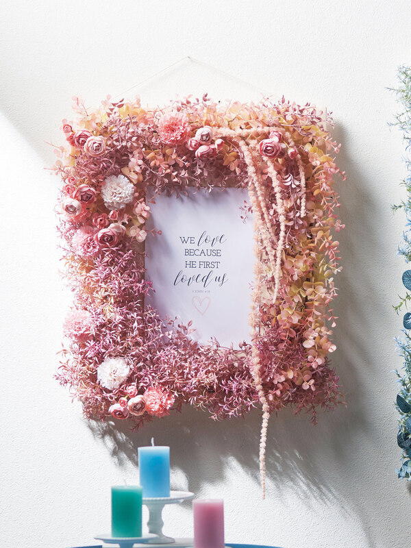 ピンクトーンのフラワーで飾るフレームアレンジ。