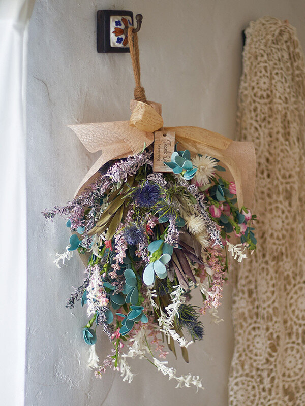 ミルフラワーハンギングをベースにドライを加えたスワッグ。