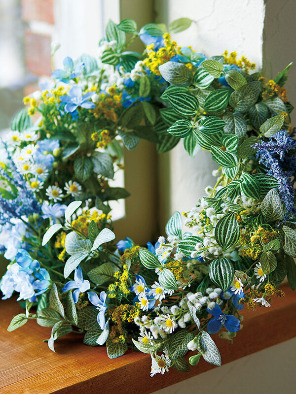 小花とフィットニアで楽しむ爽やかなリース。*リースベースは使用せず、使用している造花のステムを組み合わせてリースにしています。作例は直径約45cmのリースに仕上がっています。