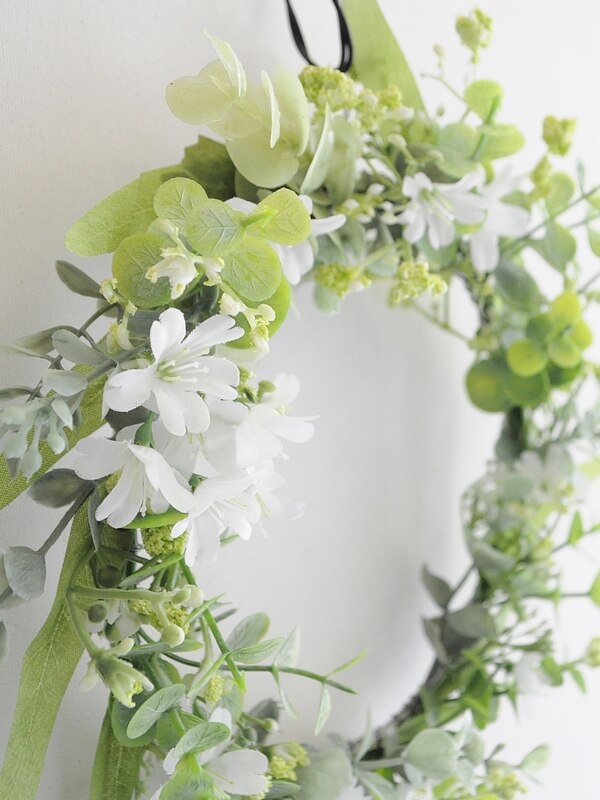 とても明るくきれいなグリーンの造花を使った、初夏にぴったりなリースです。リースの土台は、アルミワイヤーで作っています。アルミワイヤーは、飾る場所に合わせた大きさの土台を作ることできるので、とても便利です。