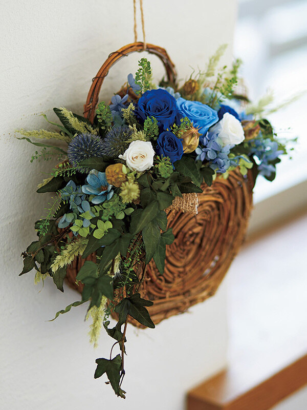 ブルー系のフラワーを壁掛けバスケットに!