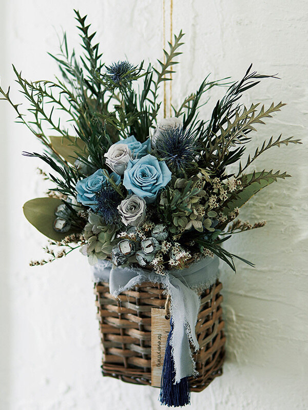 ブルー&グリーンでまとめた壁掛けバスケット。